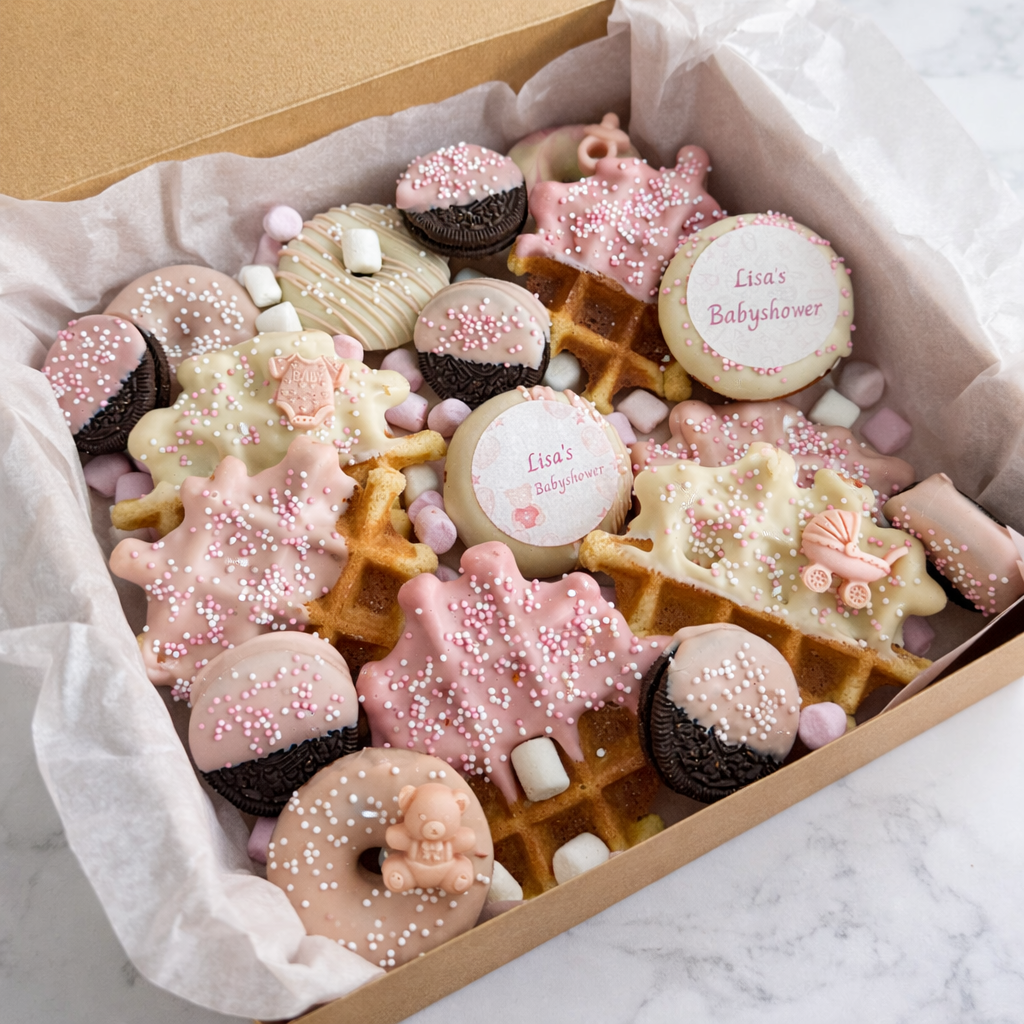Vier de komst van jullie kleintje met deze onweerstaanbare Waffooz-box! Boordevol heerlijke mini waffooz rings en wafels, gegarneerd met echte Belgische chocolade en helemaal gepersonaliseerd voor de speciale gelegenheid.