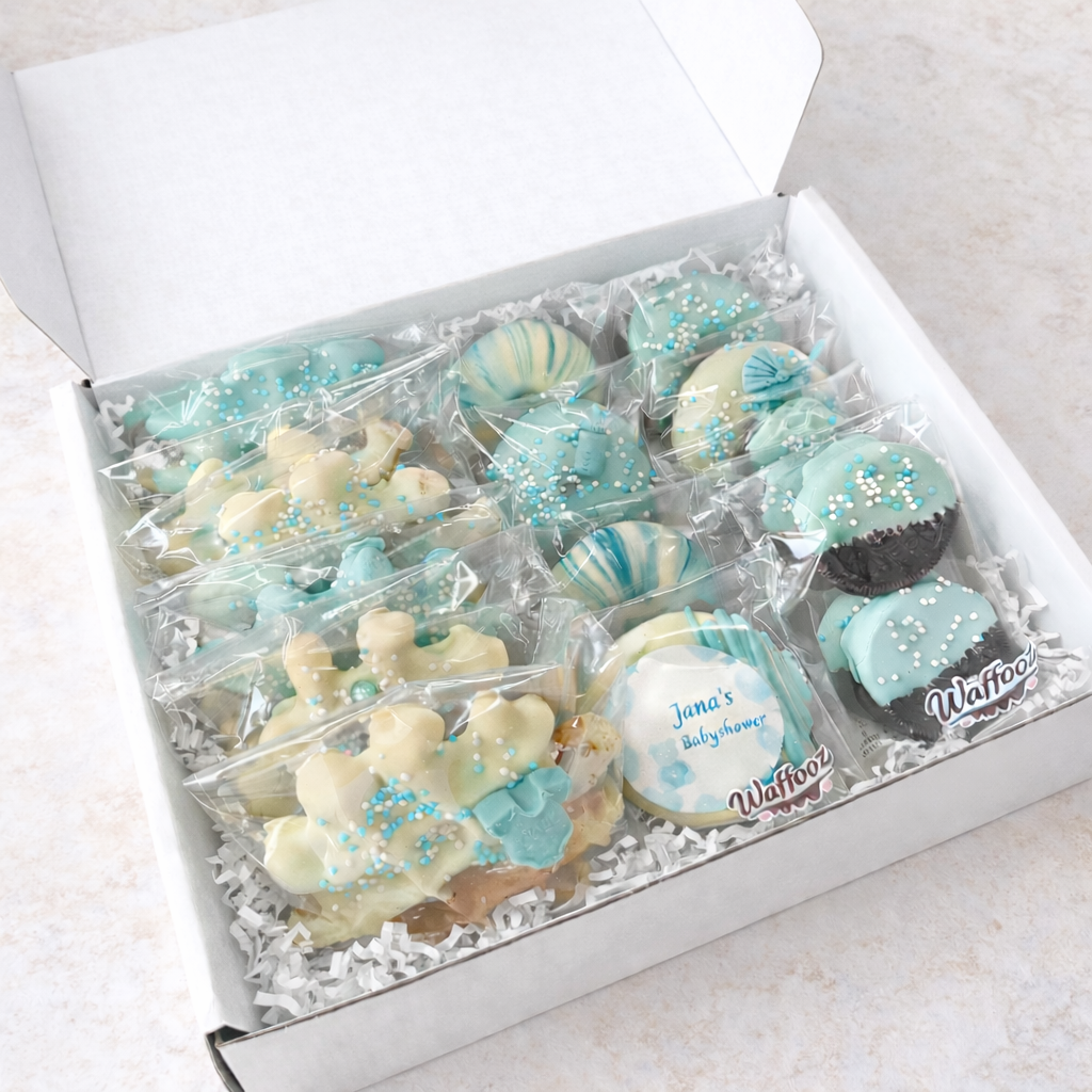 Vier de komst van jullie kleintje met de Little Blue Star Verzendbox - een liefdevolle verrassing die per post verstuurd wordt. Deze box is gevuld met heerlijke wafels en mini Waffooz rings, afgewerkt met echte Belgische chocolade en gepersonaliseerd voor deze bijzondere gelegenheid.